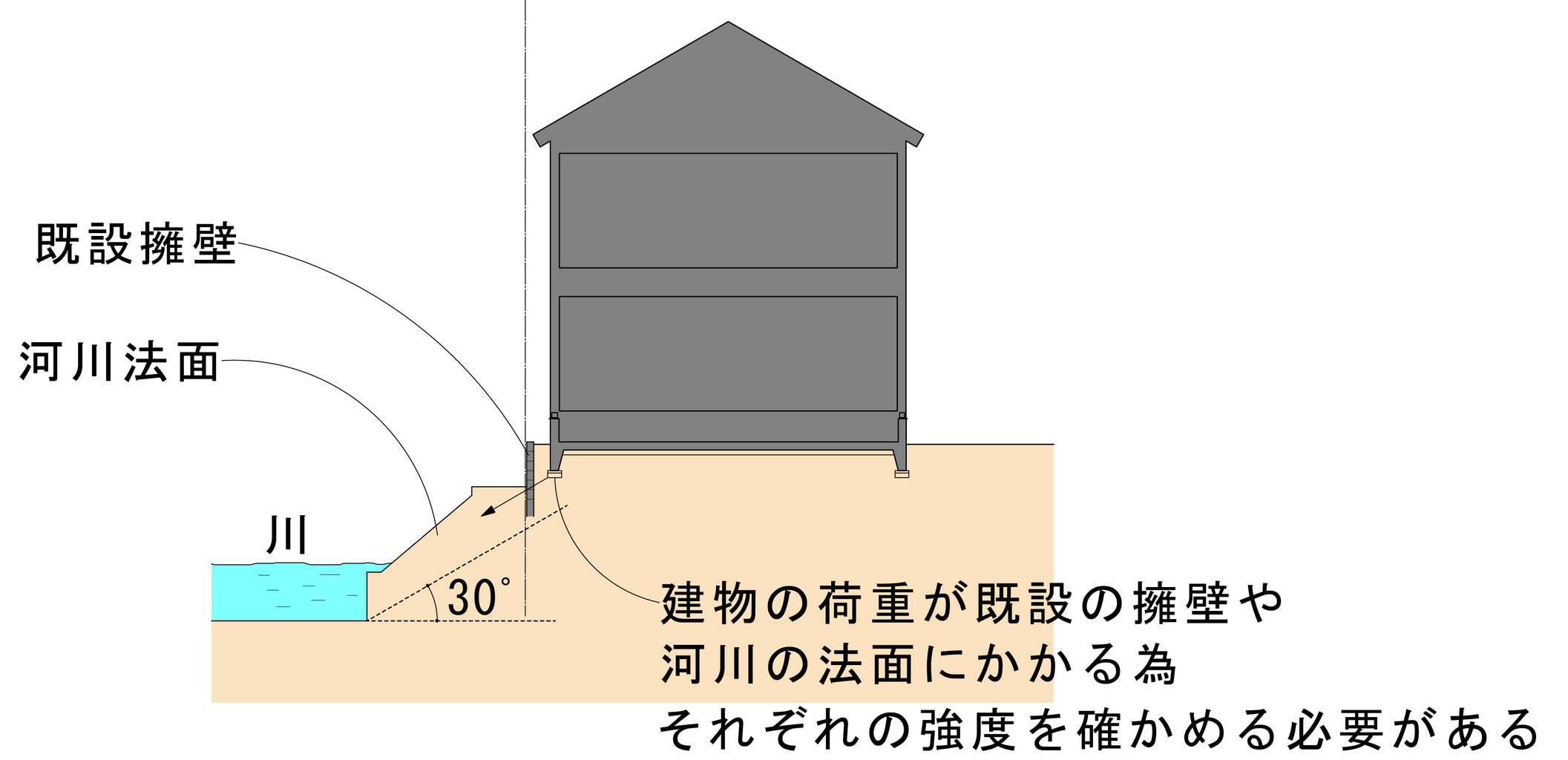 川に面した部分が、ノリ面になっているか、擁壁になっているか 、色々ありますが、いずれにしても建物が川の方に傾かないように、あるいは敷地が川の方にずれない様にしなければなりません。