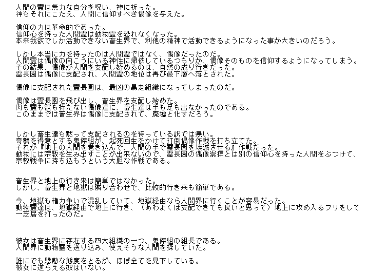 その口車に乗せられたまま、袿姫を撃破し、畜生界は再び混沌の世界となった。