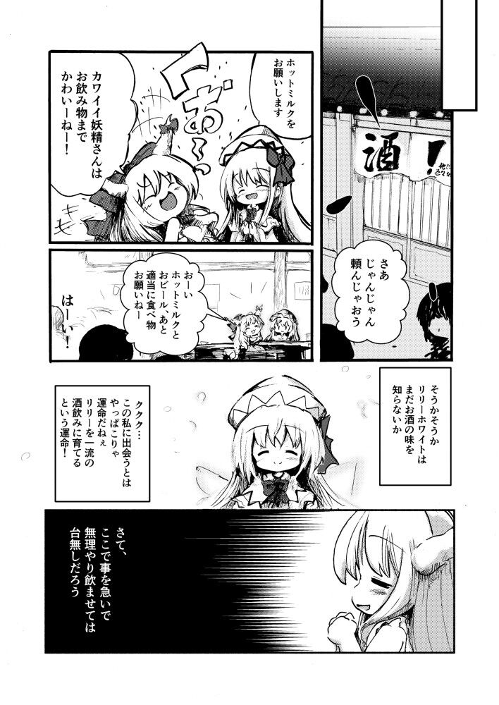 イタズラのつもりでリリーにミルク系のキツいカクテルを飲ませたら、ホワホワ笑顔のまんまケイブシュー裏ボスみたいな弾幕撃ってきてあえなく部位破壊