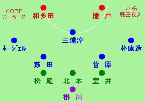 89分、神戸:三浦淳のフリーキックから松尾のヘディングシュートは都築がセーブする。