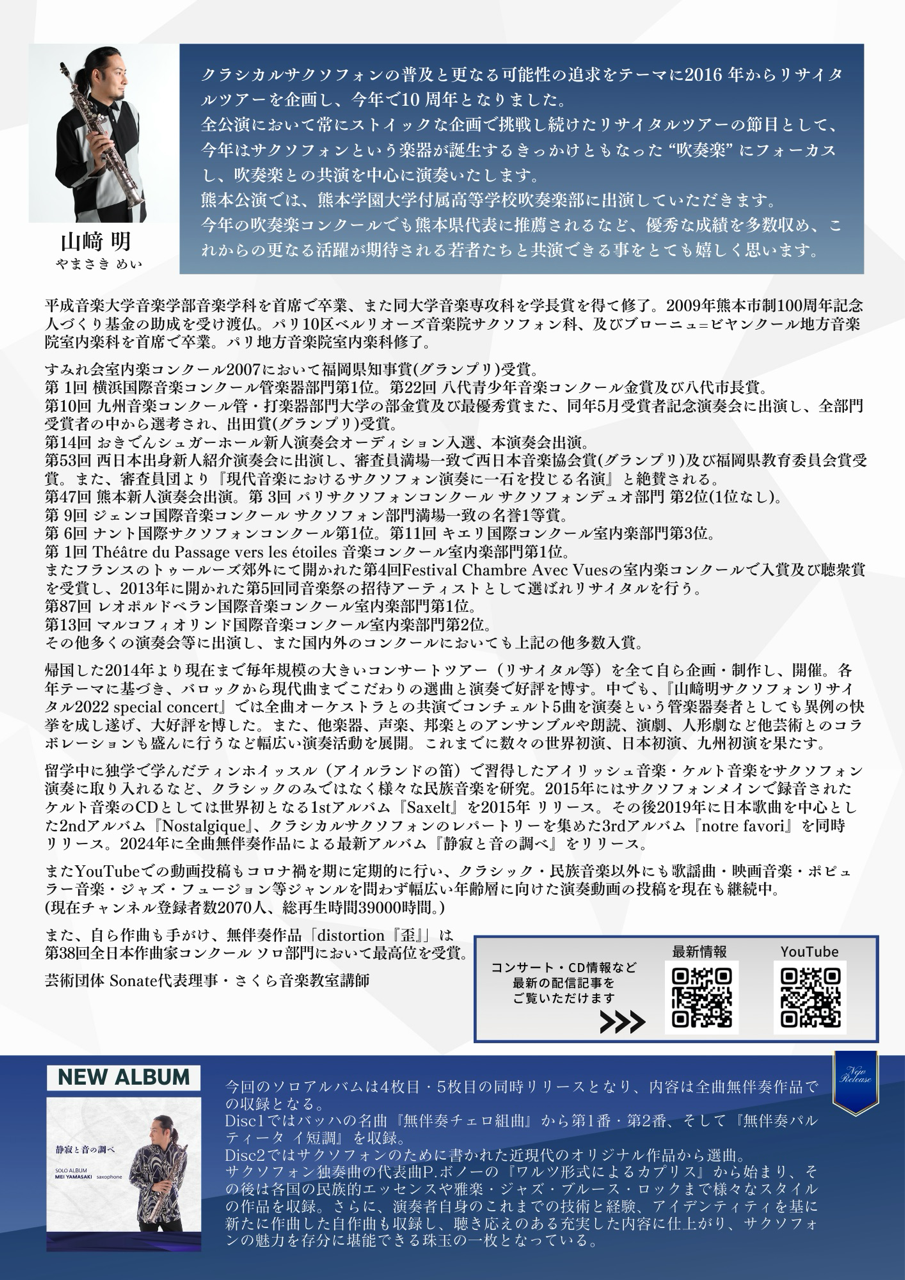 熊本市健軍文化ホールでジョイントリサイタルを開催し、好評を博す。第129回くまもとNHK美術館コンサート出演。第11回キエリ国際音楽コンクール室内楽部門第3位。第3回パリサクソフォンコンクール サクソフォンデュオ部門最高位。第9回ジェンコ国際音楽コンクールサクソフォン部門満場一致の名誉一等賞、同コンクール室内楽部門第2位。