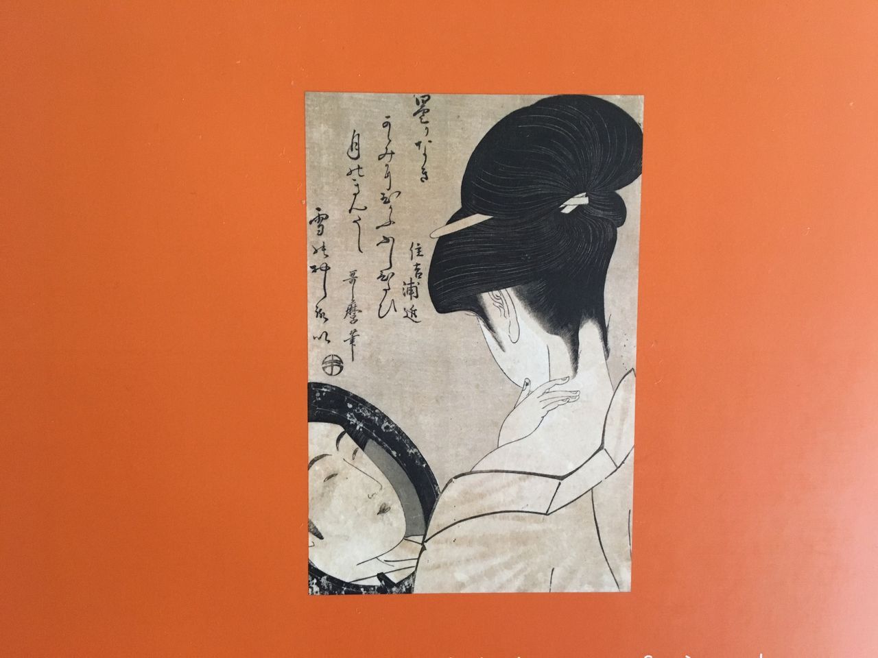化粧台に向かう女性を背後から描いた浮世絵の色彩の鮮明さ、大胆な構図などに