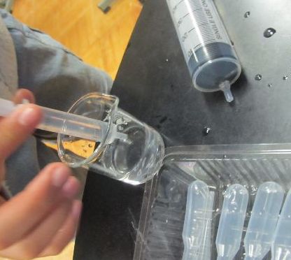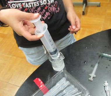 空気をうすくすると気圧が減って、水が注射器の中に入ってくるというもの。