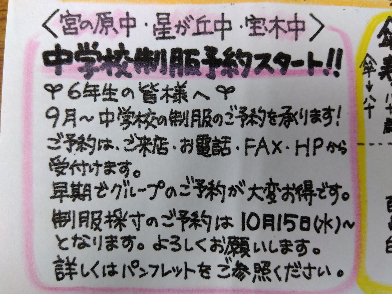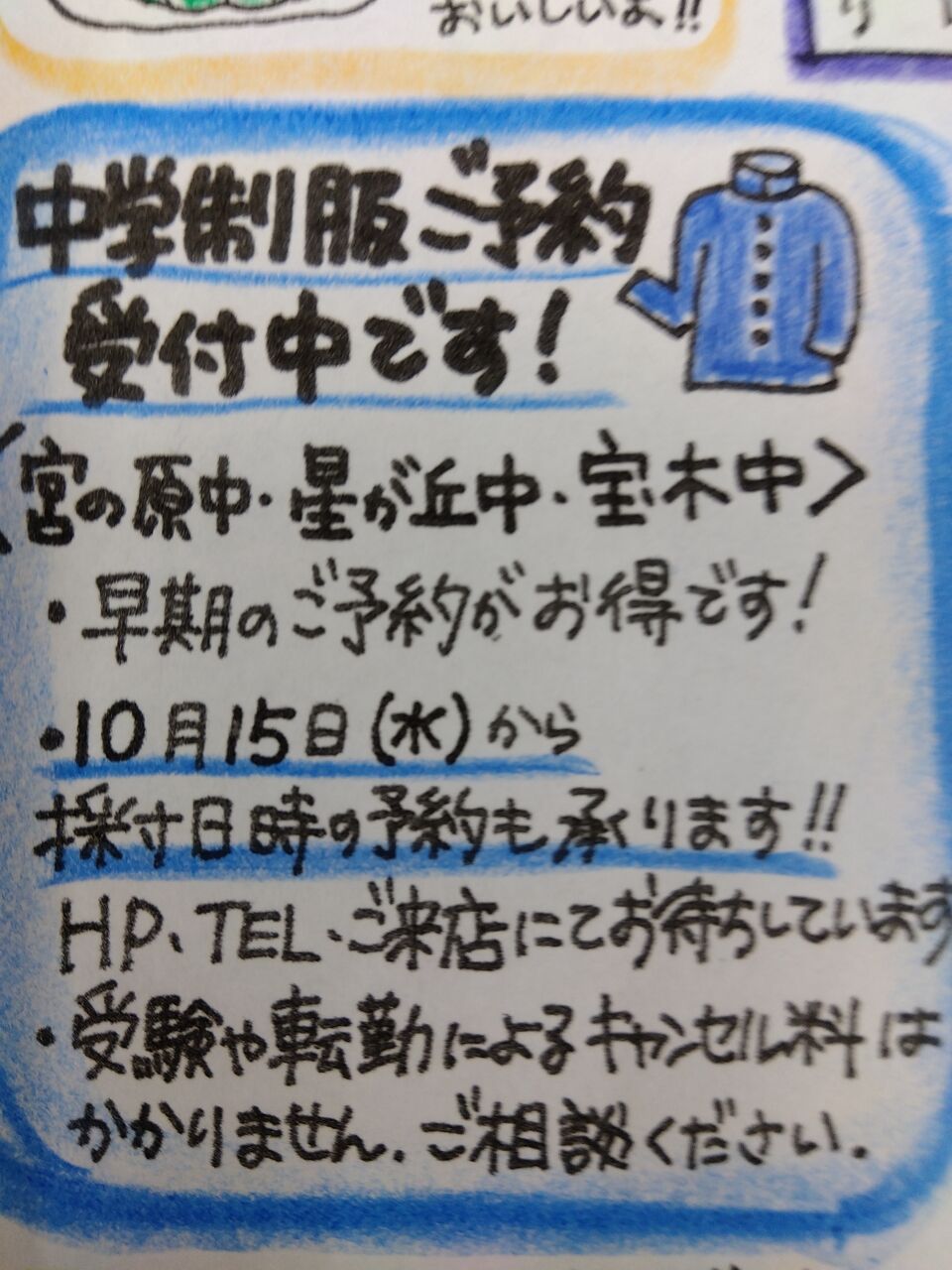 制服採寸の時期は学校別の男女別になっておりまして、10月15日(火)から予約が出来るようになります。