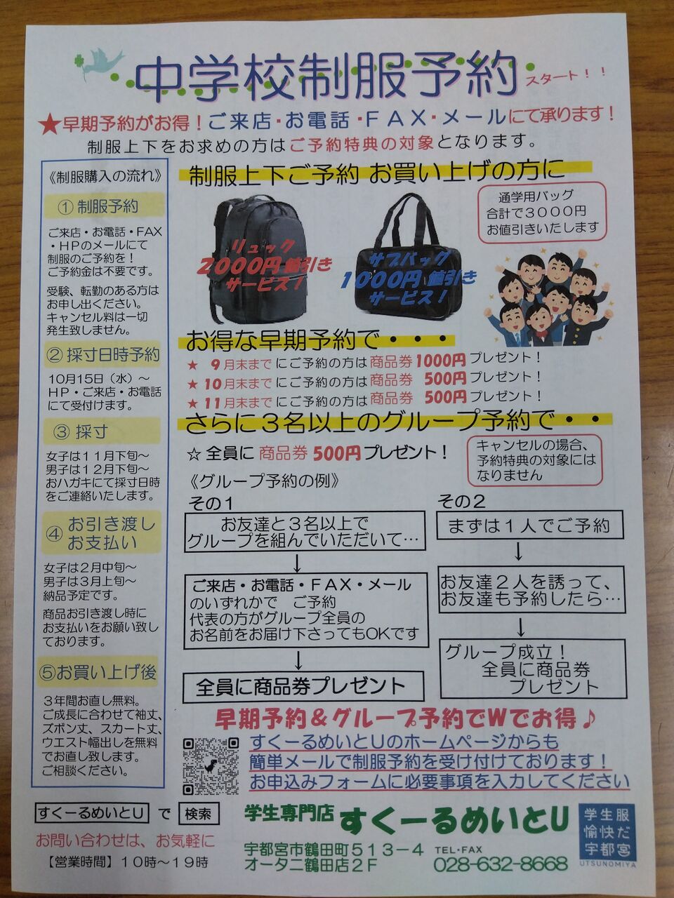 只今、中学校の制服の予約を受け付け中です!