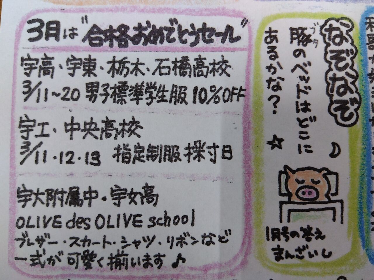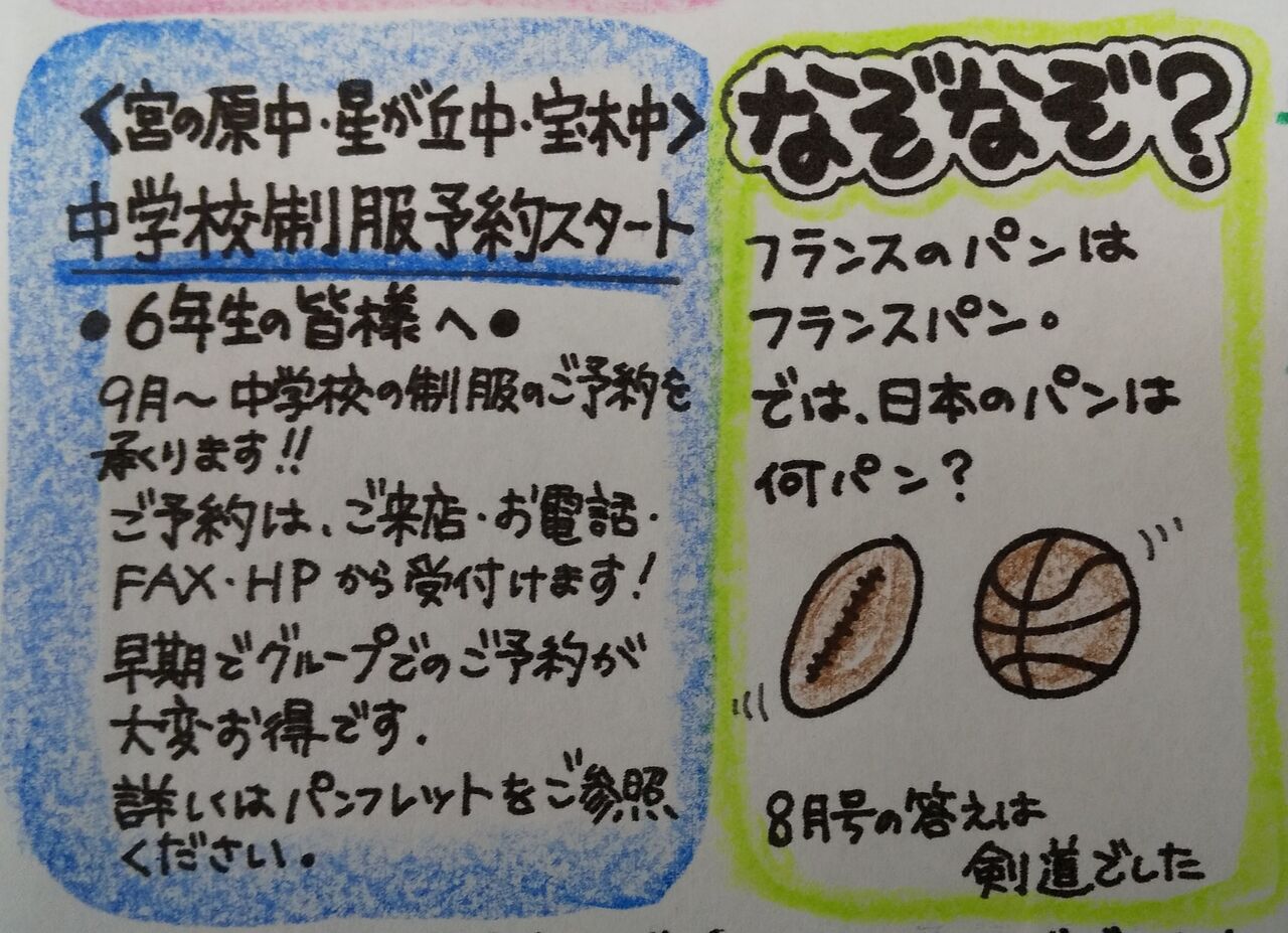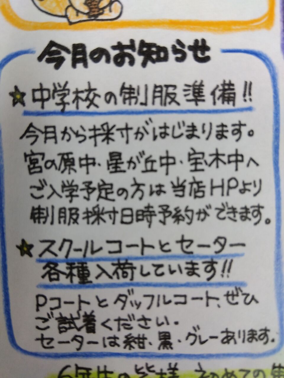 1月の制服採寸は星が丘中の男子、宝木中の男子、と続きます。ご予約がまだの方は今月中にご連絡くださいね。小学校の卒業式に間に合うように、ご用意させていただきます。