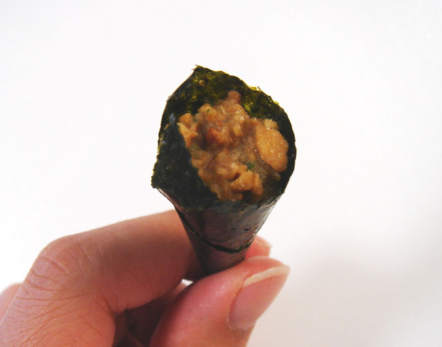 プレーン(?)と、ブラックペッパー味があるのですが、今回は入門編ということで、ベーシックな方を購入。(といっても、ペッパーが置いてなかったためなのですが)ツブツブの物体を固めたものが焼き海苔で円錐形に巻かれてます。