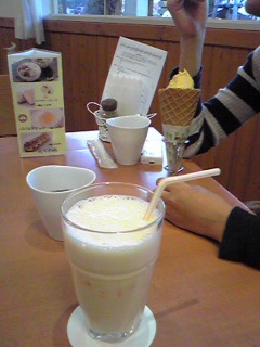 今、お土産で村の駅とゆー所に来ておやつtimeです(^0^)タマゴやで…ゆうなCはソフトクリーム・シーはミルクセーキです★出て来た黒豆茶も身体にGood!