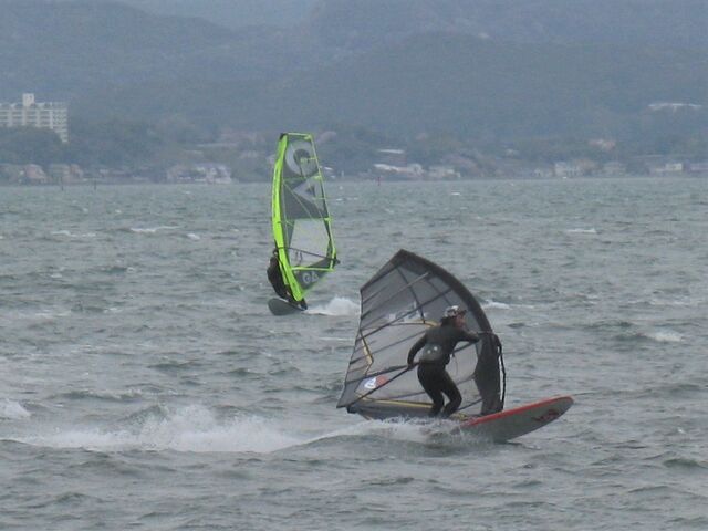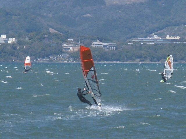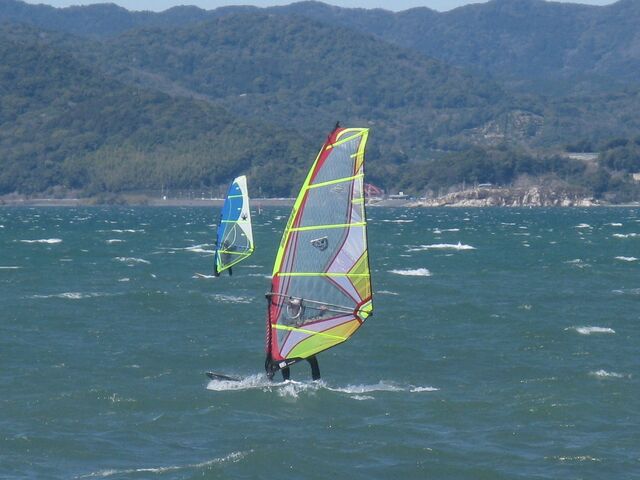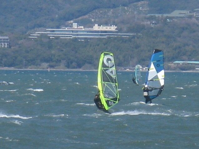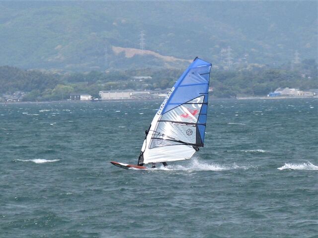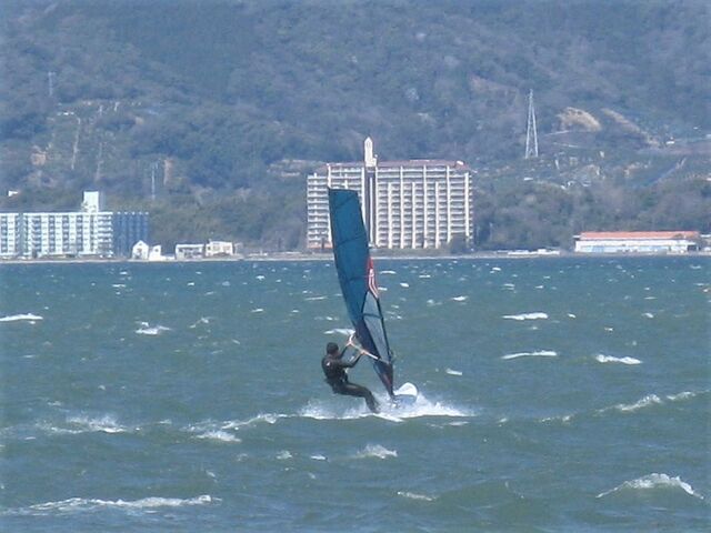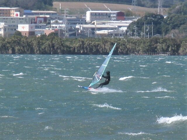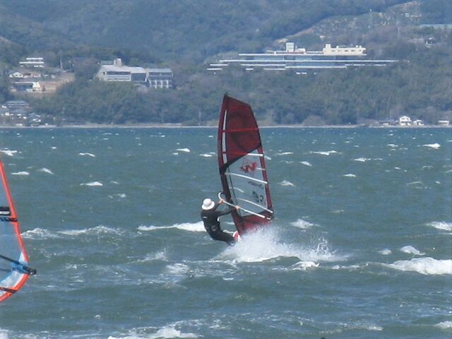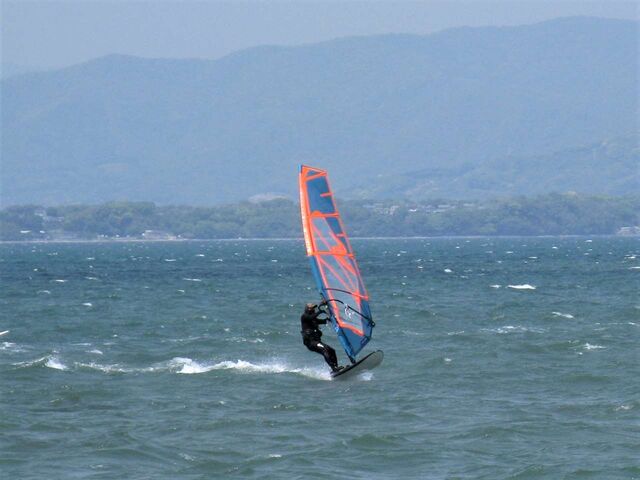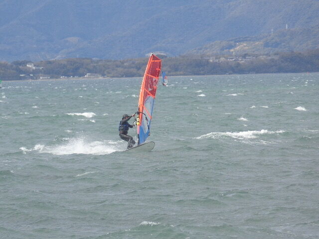 風は13時過ぎから南よりで入り始め、今年初の72を張ってスタート。始めはブローが続かず、片道走っては、タラタラ戻って次のブローを待つことの繰り返し。そのうちブローが強くなって少し続くようになってきて、予想通り15時前にはジャストオーバー。あぁ、やっぱりか・・・と思いながら、ダウンを引き直して乗り続けたものの、高所で空気が薄いのか、やたら息が切れる。
