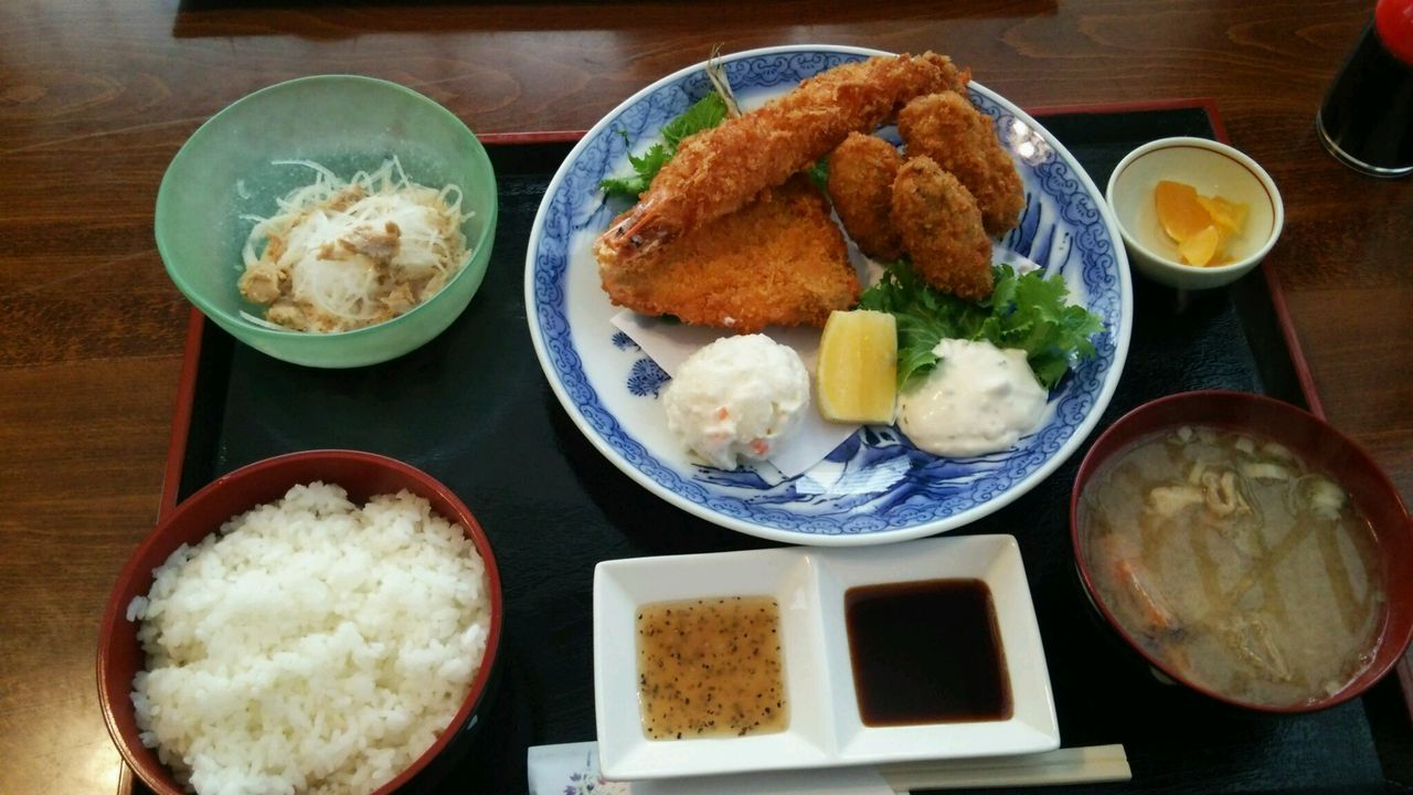 ミックスフライ定食 大エビ.牡蠣.アジのフライ。エビが超プリプリ