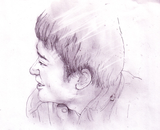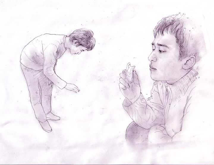 素敵だね。デッサンってとこが。思わずやってみたくなるよ。ウエブより断然そっちのほうが興味ある。顔の表情だけじゃなくて、真人君がしゃがんでる所だったり、何かを覗き込んでいるところだったり、真っ白い空間に一人ぽつねんと立っているちょっと頼りな気な後ろ姿だったり…。全身像で描いてみたいシーンが頭に浮かぶよ。ウエブよりこっちをメインにすすめていいかな。