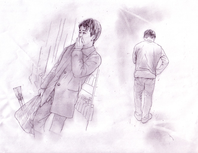撮った写真の中から、こちらで選んだ表情とか格好とかを参考にしてもらって、曲毎(ページ毎)に挿絵をつけてもらう感じで、鉛筆(?)みたいなやわらかなタッチでデッサンで僕の姿を描くのはどうだろうか?(表情とかだけ参考にして貰って、格好や服装、背景は自由に描いて貰うのもよい)と思ったのでした。そうすることで、その線画そのものが「繊細」のイメージと重なり合うような気がしたのよ。