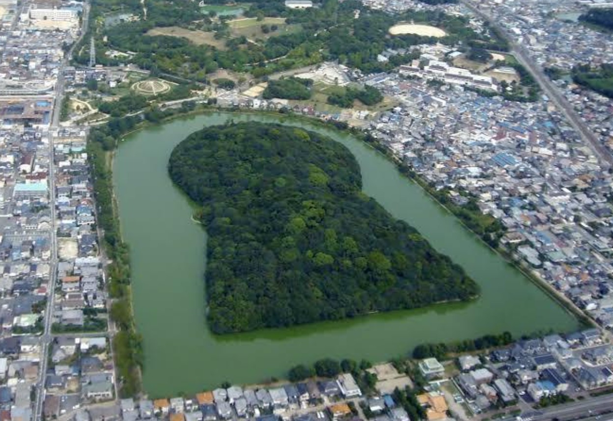 上空から見ると「鍵穴型」をしており、周囲には三重の濠(ほり)が巡らされています。