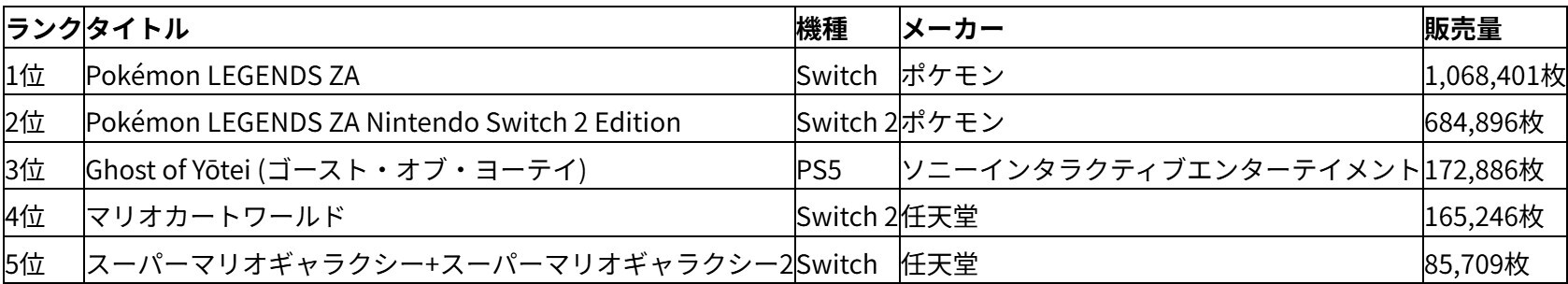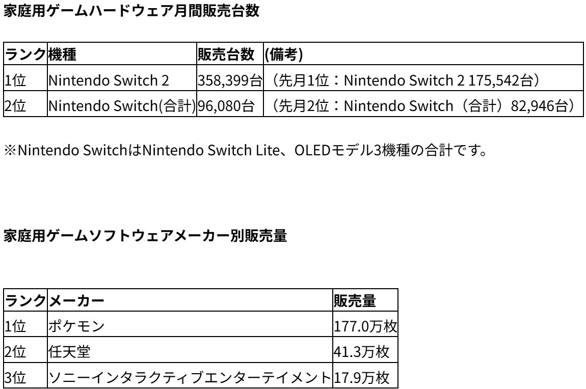 ハードウェア部門では、Nintendo Switch 2が約35.8万台を販売し、前月の倍以上を記録。限定版「Pokémon LEGENDS Z-A Edition」の影響で需要が大きく伸びたとされている。