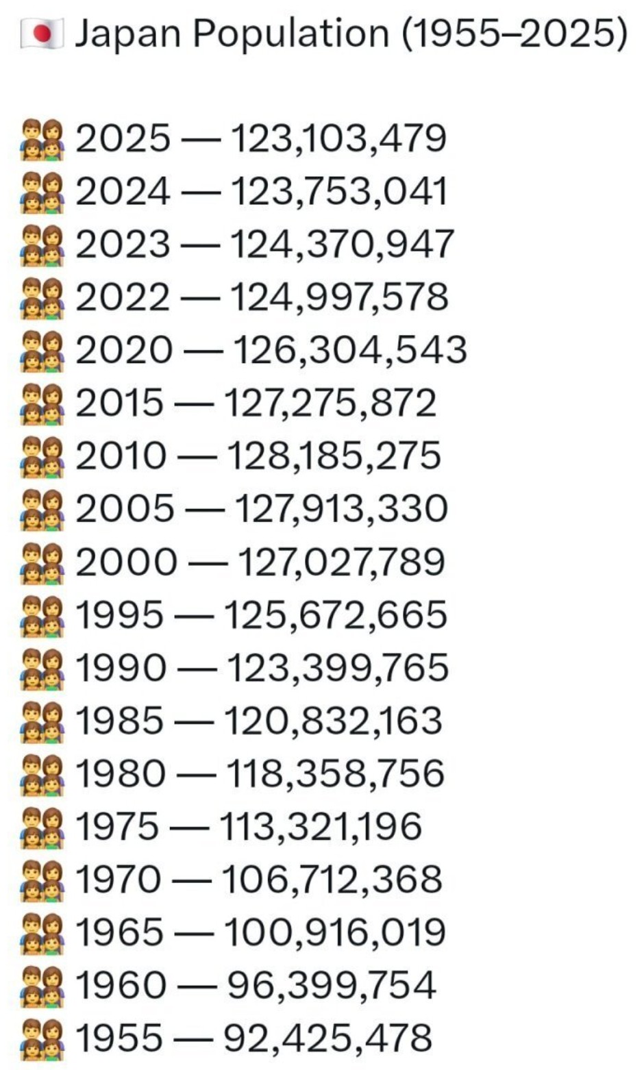 一方、日本は1980年代に“最も人口が安定していた時期”を迎え、2010年頃にピークを記録してからは減少傾向に転じた。ここ5年間だけでもおよそ300万人規模の人口減少が見られる。