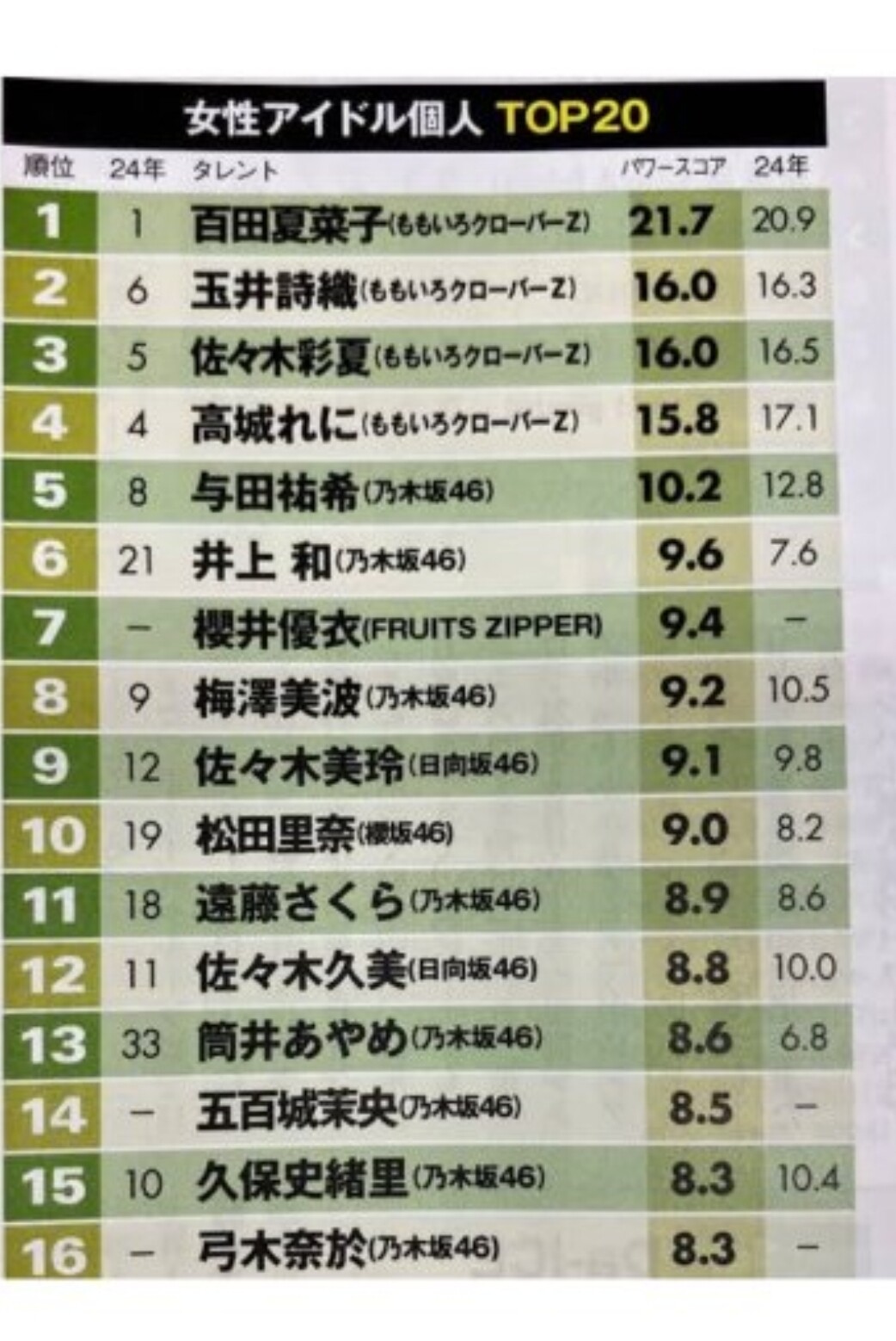 当時のランキングでは、AKB48グループのメンバーが上位を占める中、4人組ユニットとして活動していたももいろクローバーZが存在感を放っていました。