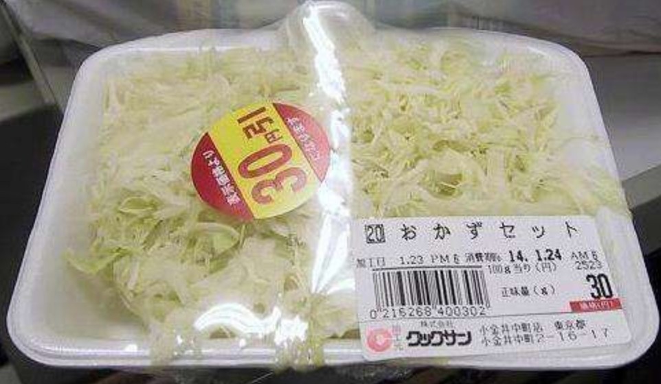 ラベルを見ると、「おかずセット」という商品名ながら、内容はキャベツだけ。しかしこれが、「手軽に野菜を摂れるように」という意図で販売されていると考えられています。
