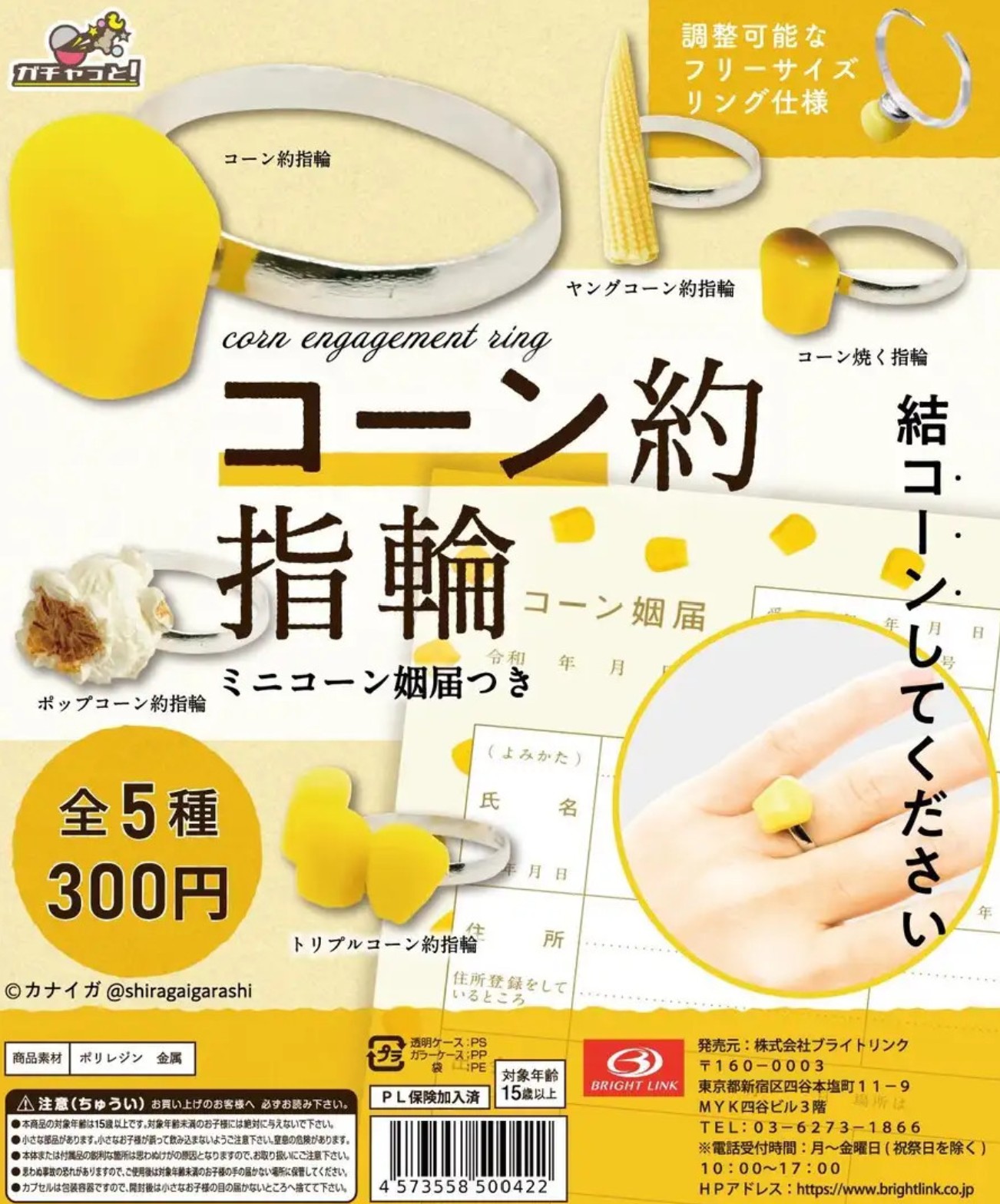 公開された写真では、指に“とうもろこし”のような形をしたリングがはめられており、そのユニークな見た目が注目を集めました。調べによると、このリングは日本のカプセルトイ(ガチャガチャ)の景品で、商品名は 「コーンエンゲージリング」。全5種類のとうもろこしモチーフのデザインが展開され、価格は300円とのことです。
