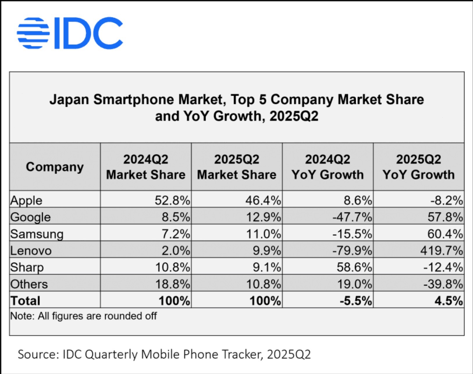 IDCの最新調査によると、Appleのシェアは前年同期の52.8%から46.4%へと下落。依然として首位ではあるものの、5割を切る結果となりました。一方で、Google(Pixel)やサムスン(Galaxy)が二桁シェアを確保し、さらにはLenovo(モトローラ)が前年比400%超えという驚異的な成長を見せています。