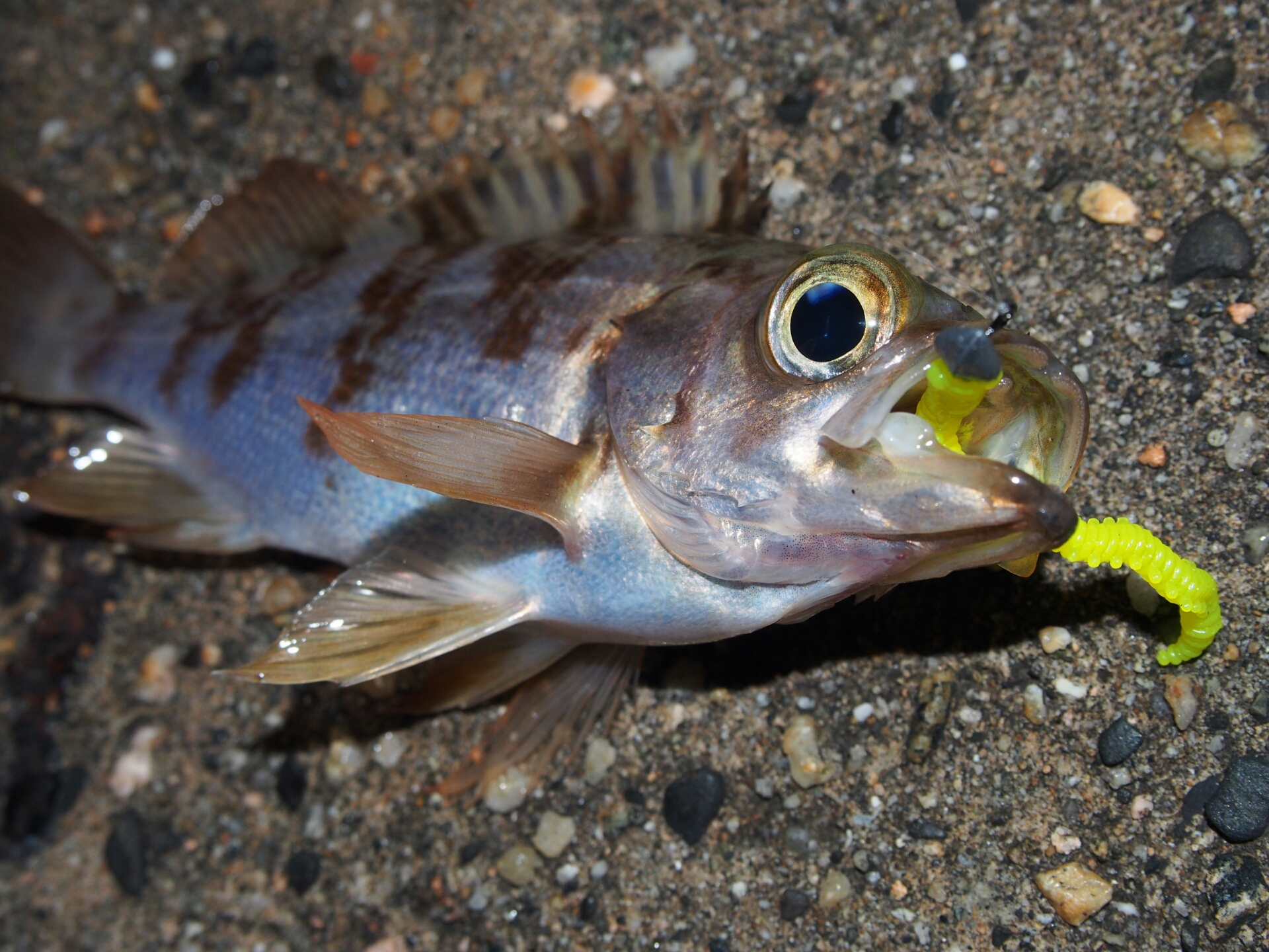 そこでプラグの頭を軽く振ってやると、飛び付くメバルもいたり、反対に離れていくヤツもいました。