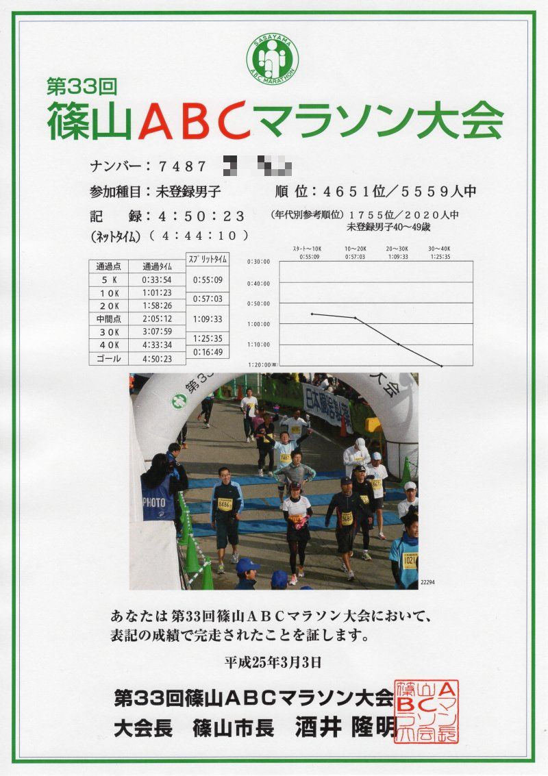 エントリーした第33回篠山ABCマラソン大会が終了。晴天に恵まれ、朝の気温は0℃と寒かったが、徐々に気温も上がりマラソン日和だったように思った。