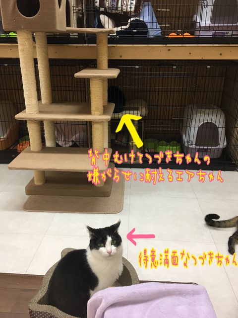 悲しいかなエアちゃんの天敵、意地悪大好きな姉妹のつづきちゃんが爪とぎベッドを占有。