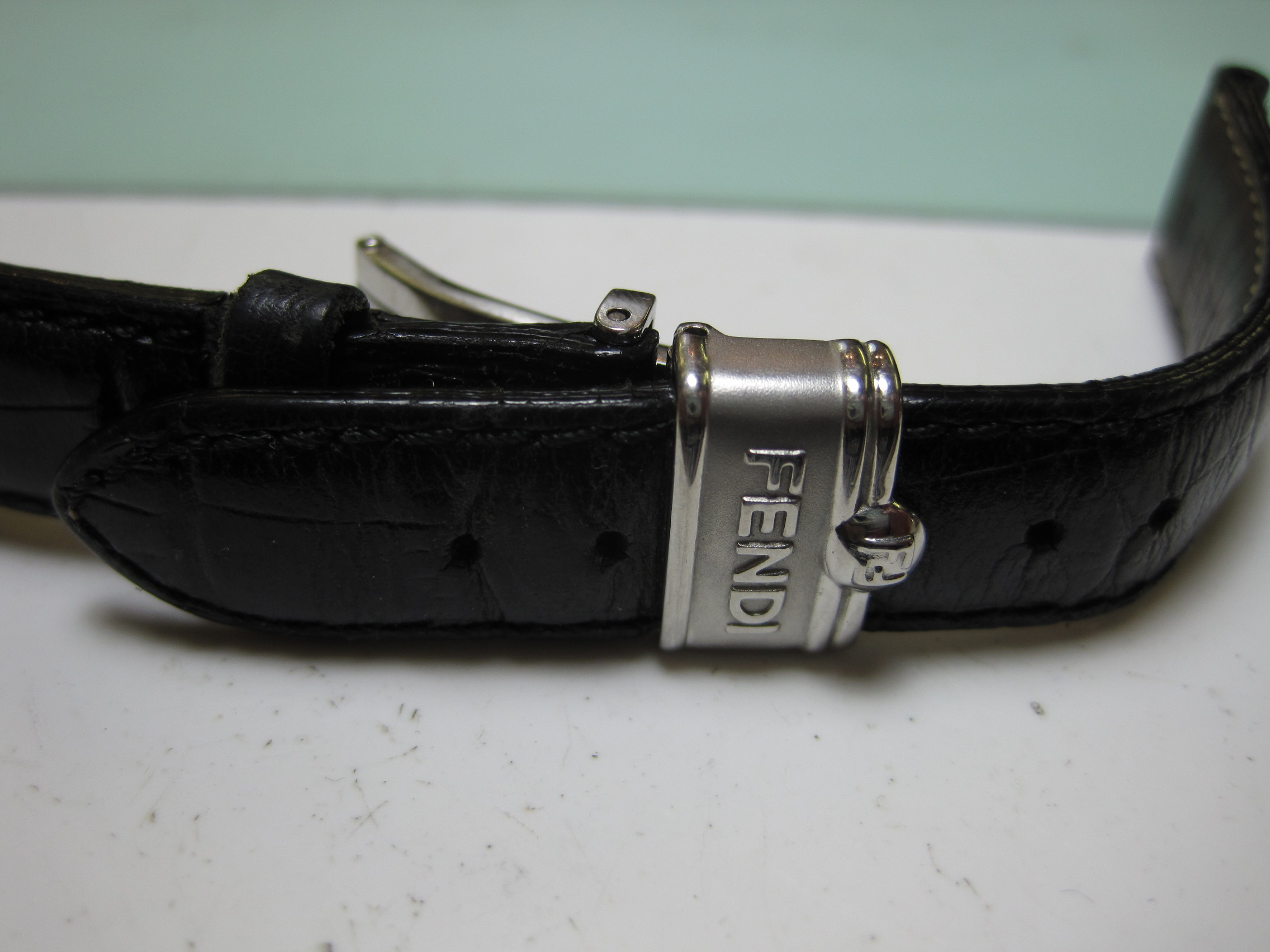 今回は革バンドの汚れが気になるお客様のご依頼ですFを組み合わせたダブルFモノグラムが特徴のフェンディの時計時計の留め具(三つ折れバンド)にもしっかりとロゴがついています革バンドは交換したほうが良いようなので新しいものに交換させていただきました純正のものが手に入らないときはこのブランドの留め金具のみ利用して既成のバンドを使用しますドイツ製 ディモデルの革バンドですバックル取り付け部分の形状が三つ折れバンドタイプと異なりますので・・・取り付けたとき このように一か所小さな穴が出来ますが装着したときは全く気にならないと思いますブランドものの革バンドタイプはこんな バンド交換の方法もあります