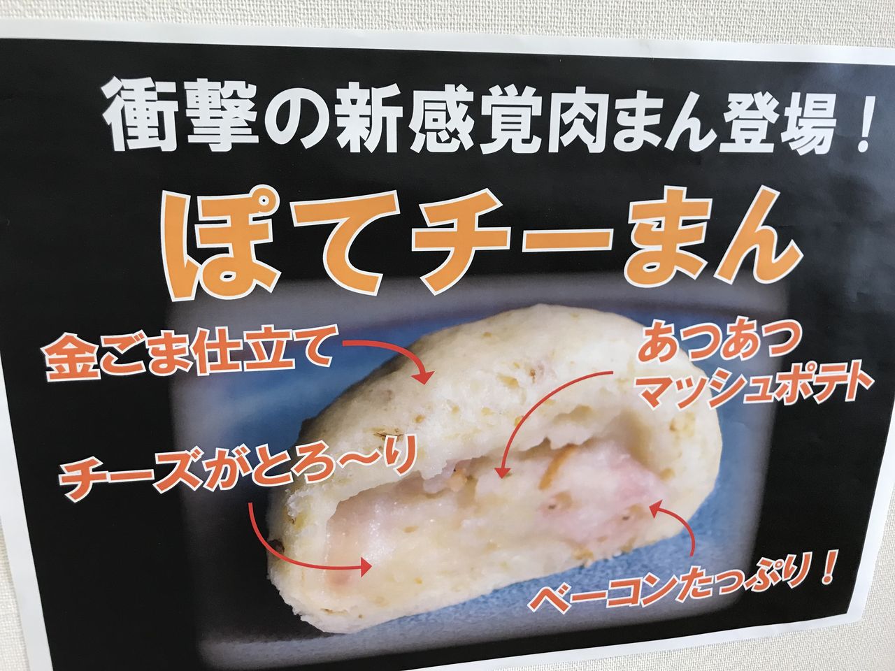2017年10月31日 ぽてチーまん発売! 新感覚肉まん「ぽてチーまん」を発売しました。中身はご覧の通りになっています。あるアメリカ人がポテトとチーズが入った肉まんを出したら売れるぞとヒントをくれ、開発した商品です。ちょっと小ぶりなのですが、マッシュポテトがぎっしり詰まっていて結構お腹がふくれます。自信作です。胡麻の藏全店で発売しています。
