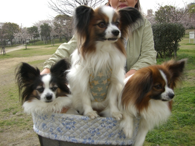 自転車の前カゴに3人。。後ろのカゴに1人。。