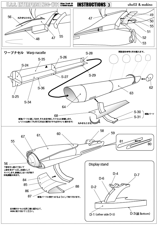 すいません。エンタープライズのディスプレイスタンドで制作上、少々気になる箇所があったので修正しました。扇形のパーツを支える箇所の下側を別パーツにしました。それと台座に少し強度があった方が良いと思い、合紙するパーツを追加しています。「Enterprise-11.pdf」と「INSTRUCTIONS-3.pdf」の二つのファイルを入れ替えています
