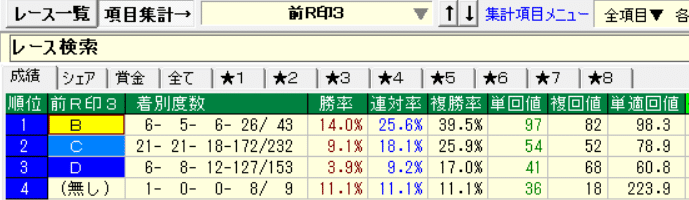 ★正直1週単位での集計は“ざる”に過ぎませんが(前走レースレベルB以上の馬が1頭もいないレースの方が多数なので必然的に前走低レベルレースの馬同士での決着が大多数・1頭の人気薄激走馬によって大きく数字が左右される等)、中長期的にレースレベルの信憑性(好走率も回収率もA&B>C>D>Eの順になる)と前走レースレベルB以上の馬の価値(前走Hレベルレース出走馬はベタ買いOK)を示すべく毎週掲載致します