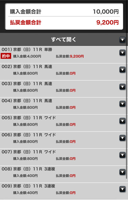 先週の主な馬券結果(日経新春杯の自身購入馬券[購入10000→払戻9200])
