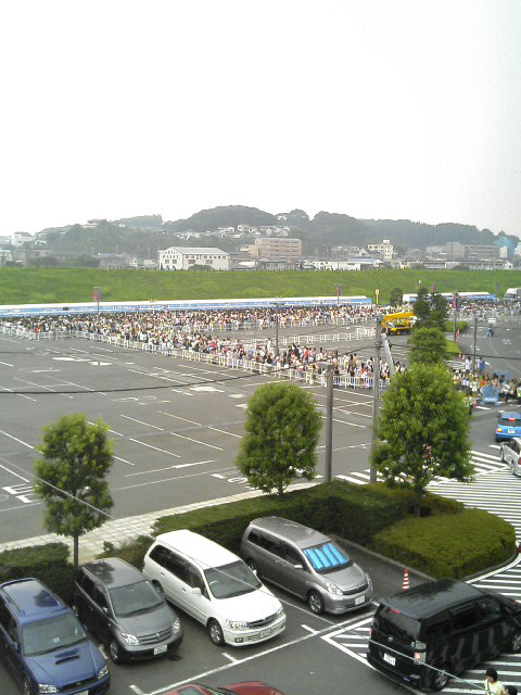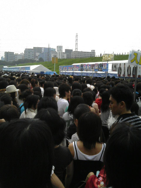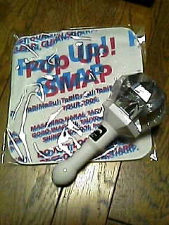上の写真はグッズ買うときの行列の模様〜。開演までまだ4時間はあるというのに、30分位並んだかな。実際売り場を目の当たりにしたら、パンフレットとかトランプとか買いたい衝動に駆られたけど、思い直してペンライトとハンドタオルだけにしました♪ って、やっぱりハンドタオルもいらなかったかなぁ。笑