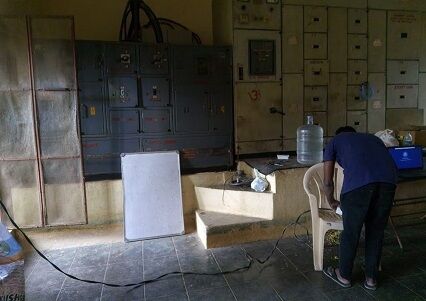 管理棟の発電機ルームには電気技師と水道技師が常駐している。写真の後ろ姿は、しきちのパソコン(右端)用に延長コードを設置してくれている電気技師。ちょっとコンセントを貸してくれと言って座り込んだ図々しい住民に「そこのテーブル使っていいよ」とオファーするばかりか、こんな気遣いまで。ありがたい。