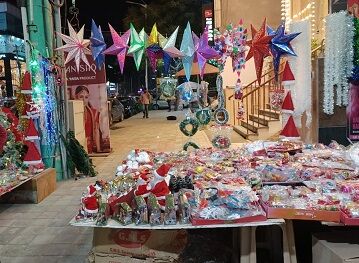 写真はバンガロール市内、カマナハリの路上にて。歩道を半分以上ブロックしてクリスマス飾りを売っていた。