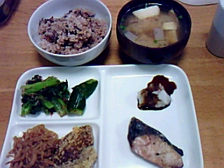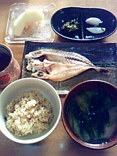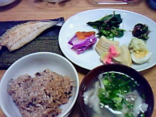 夕飯は玄米ご飯と三年番茶、つくね芋スープ。おかずはカマスの干物とタケノコと生麩の炊いたんと小松菜のおひたし。赤大根と干し柿の酢モノ、大根葉とジャコの煎り煮。朝の残りのジャガイモ。
