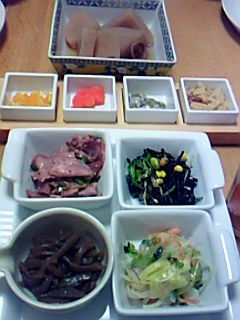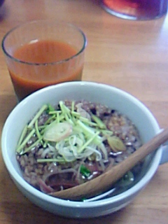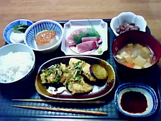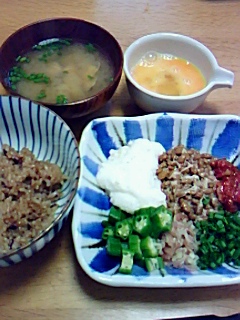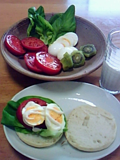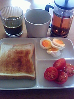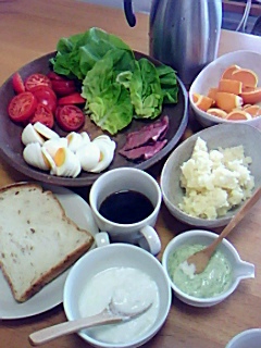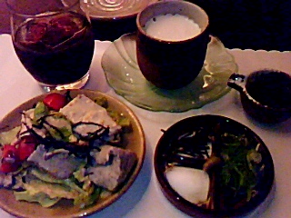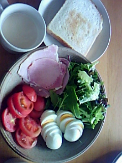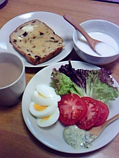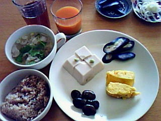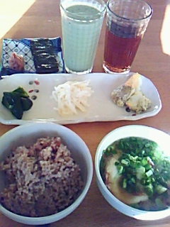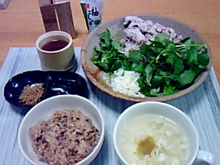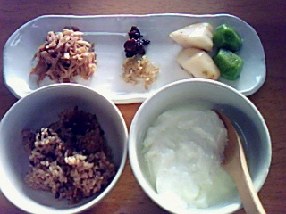 朝は大根と貝柱の和え物とバジルマヨネーズジャガイモとキュウリの即席漬けとのりと梅。落とし卵味噌汁と玄米ご飯。青汁入り飲むヨーグルトと三年番茶。