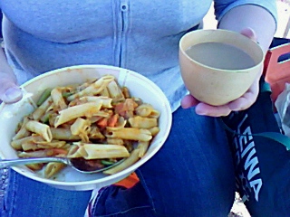 ササズの玄米おにぎりに鯖ちゃんちの手作り肉まん(これが最高!ガワがうまい!)広瀬さんちの玄米もち焼き。みんなの家のペンネパスタ。チャイにカフェオレ後いろんな味見。