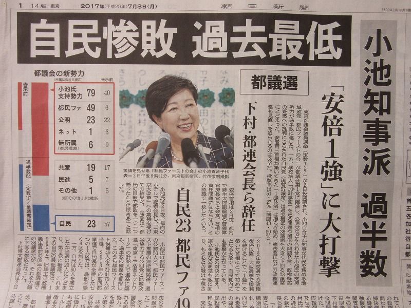 夜更かしの朝が明けて、新聞には自民惨敗の大見出しが躍っている。「都民ファースト」という伏兵に足元をすくわれて、都議選での自民党の獲得議席数が、過去最低を下回ったというのだから尋常ではない。天下に怖いものなしに見えた安倍1強だったが、意外な弱点を内蔵していたということだ。