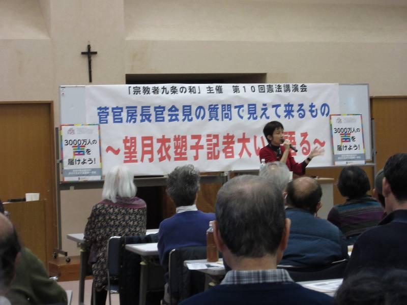 そこへ登場したのが望月衣塑子記者です。初めてナマで見たわけですが、赤いドレスに身を包んだ「女闘士」を思わせる歯切れのよい語り口でした。文章と同じように、力強い説得力で人を引きつけます。適宜なインターバルで聴衆を笑わせるサービス精神もあるのですが、やはり伝えたいのは、「安倍政治は日本をどこへ連れて行くのか、行き先は戦争ではないのか」という不安です。そして結論は「九条は世界を救う」ということでした。