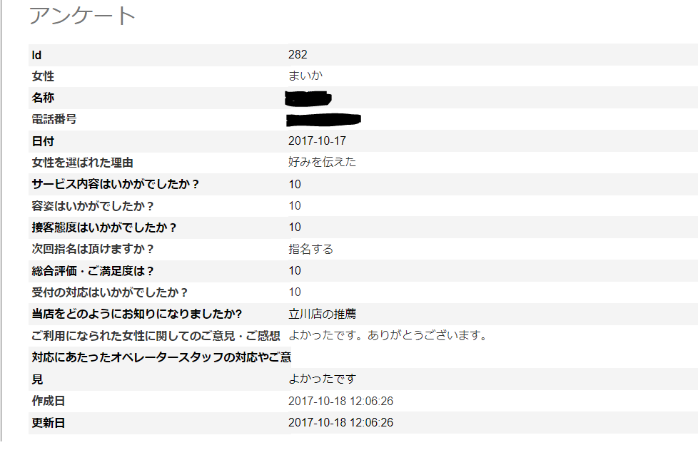 2017年10月25日 まいかさん アンケート S様ご利用ありがとうございます。新宿店のご利用は初めてとの事でお楽しみいただけて良かったです。立川店にも劣らずお楽しみいただける奥様沢山いますので、お好み等詳しくお聞かせいただければよりご満足いただけるかと思います。立川店ともども今後とも宜しくお願い致します。