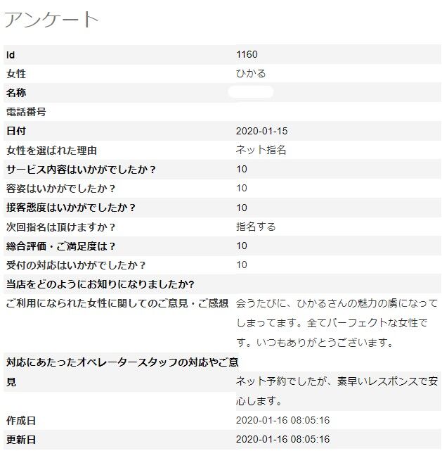 2020年01月22日 ひかるさん アンケート1/22 O様、ひかるさんへのアンケートをありがとうございます。絶賛のアンケートをいただいたこと、ひかるさんに、伝えておきます。今後とも、宜しくお願い致します。