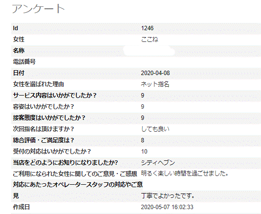 2020年05月07日 ここねさん アンケート③ 5/7更新 K様 いつもご利用ありがとうございます。楽しい時間を過ごせ満足頂けまして、誠にありがとうございます。当店は、実技講習がないお店なので、次回、もしよろしければ、感度や濡れぐわいなので、コメントもありましたら助かります(笑)お名前を出して恥ずかしい場合は、名前と遊んだお日にちも隠す事もできますので、ご相談下さいませ♪またお誘いしていただけましたら幸いです。今後ともよろしくお願いいたします。※次回はアンケート割でご案内させていただきますので受付時に「アンケート割で」とお伝え下さいませ。ただし同じ女性のアンケート割引は適用外となりますm(__)m