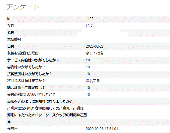 2020年05月08日 いよさん 2月のアンケート③ 5/8更新 I様いよさんへのアンケートありがとうございます。アンケートが掲載をしていなくて申し訳ございませんでした。また、10点満点ありがとうございます。当店は、実技講習がないお店なので、次回アンケートいただける際はもう少しどこが良かったかお教えいただけましたら助かります。今後ともどうぞ宜しくお願い致します。※次回はアンケート割でご案内させて頂けますので、受付時に「アンケート割で」とお伝え下さいませ。ただし同じ女性のアンケート割引は適用外となりますm(__)m