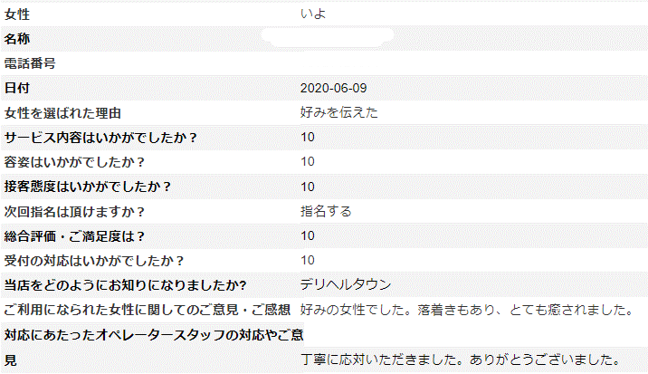 2020年06月16日 いよさん アンケート④ 6/16更新 T様 初めてのご利用ありがとうございました。いよさん落ち着いたオトナ女子という感じで癒し系でございますね。また、指名でお誘いいただきましたがタイミングが合わず申し訳ございませんでした。いよさんも次回お会いできる事楽しみにお待ちしておりますのでタイミングが合いましたらお誘いくださいませm(__)m