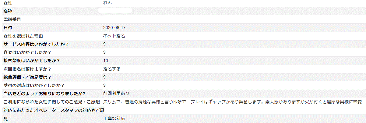 2020年06月20日 れんさんアンケート⑥ 6/20更新 K様 こいつもご利用いただきありがとうございます。いつもは新宿利用ではございませんが今回は新宿まで来ていただき御礼申し上げます。次回アンケート割にてご案内させていただきますの受付時「アンケート割で」とお伝え下さいませ。
