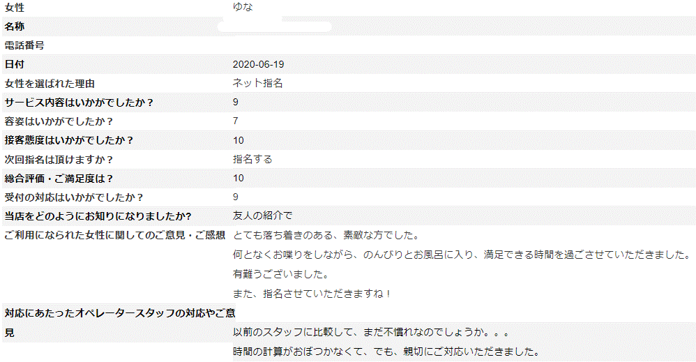 2020年06月20日 ゆなさんアンケート⑧ 6/20更新 T様 久し振りに当店をご利用いただきましてありがとうございました。見た目も性格も可愛らしく癒され指名のお客様が続出でございます。また、今回は到着時間などご迷惑をお掛けしたことをお詫び申し上げます。以後そのような事が無いよう努力して参りますのでまたのご利用をお待ちしています。※次回はアンケート割でご案内させていただきますので受付時に「アンケート割で」とお伝え下さいませ。ただし同じ女性のアンケート割引は適用外となりますm(__)m