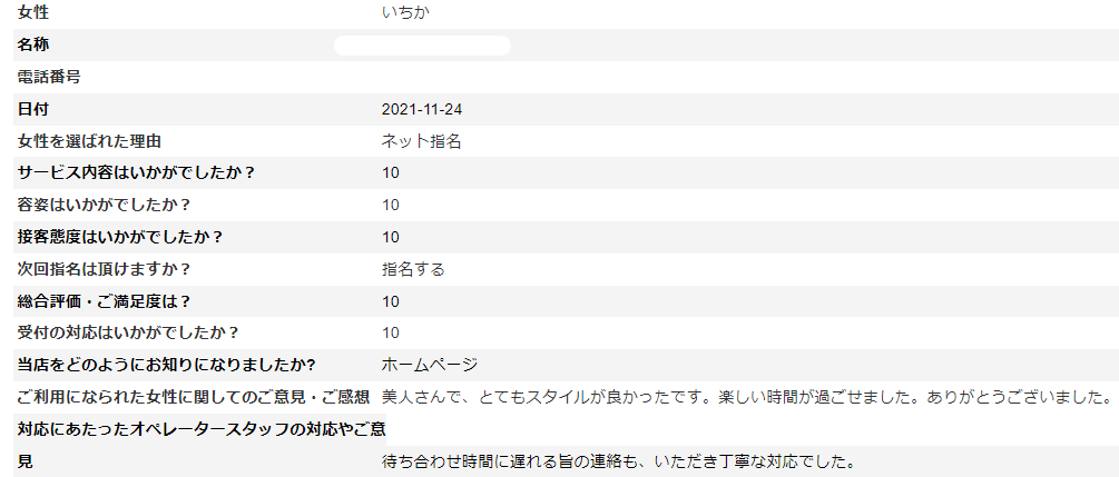 2021年11月29日 ふみえさん🈠アンケートいただきました~ 11/29更新♪ H様 いつもご利用ありがとうございます。また、お手数をおかけして貴重なご意見ありがとうございます。当店は、実技講習がないお店なので、次回アンケートいただける際はもう少しどこが良かったか具体的にお教えいただけましたら助かります。今後ともどうぞ宜しくお願い致します。※次回はアンケート割でご案内させて頂けますので、受付時に「アンケート割で」とお伝え下さいませ。ただし同じ女性のアンケート割引は適用外となりますm(__)m