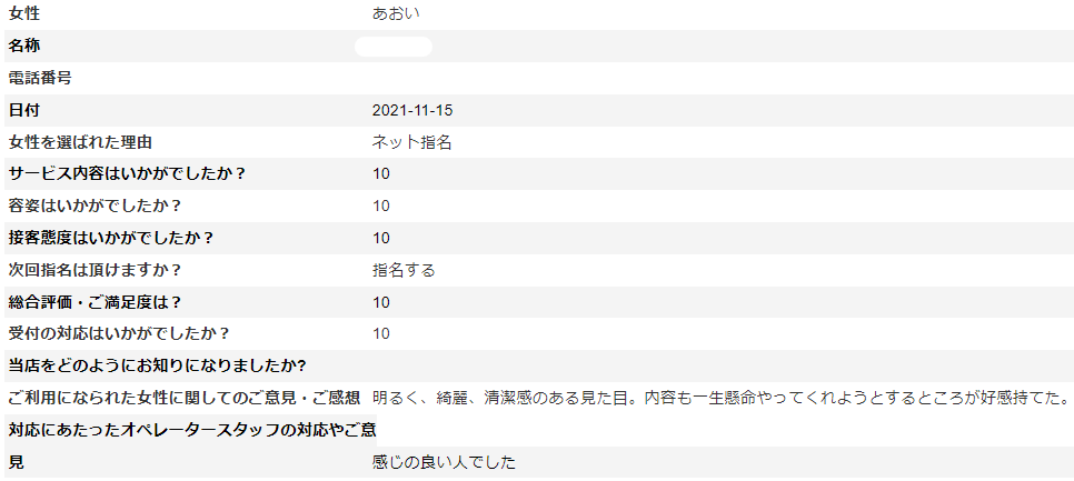 2021年11月29日 あおいさんアンケート⑧ 11/29更新♪ S様 いつもご利用ありがとうございます。また、お手数をおかけして貴重なご意見ありがとうございます。当店は、実技講習がないお店なので、次回アンケートいただける際はもう少し具体的にどこが良かったかお教えいただけましたら助かります。※次回はアンケート割でご案内させて頂けますので、受付時に「アンケート割で」とお伝え下さいませ。ただし同じ女性のアンケート割引は適用外となりますm(__)m
