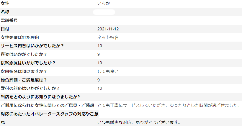 2021年11月29日 いちかさんアンケート④ 11/29更新♪ Y様 いつもご利用ありがとうございます。また、お手数をおかけして貴重なご意見ありがとうございます。当店は、実技講習がないお店なので、次回アンケートいただける際はもう少しどこが良かったか具体的にお教えいただけましたら助かります。※次回はアンケート割でご案内させて頂けますので、受付時に「アンケート割で」とお伝え下さいませ。ただし同じ女性のアンケート割引は適用外となりますm(__)m